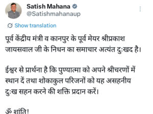 Kanpur News:पूर्व केंद्रीय मंत्री श्रीप्रकाश जायसवाल का निधन